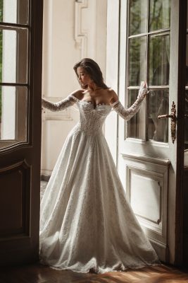 Effortless elegance with modern versatility. Virginia gown is a full-length corded lace gown featuring a structured bodice, soft sweetheart neckline, and a long train. Designed with modular details for a customizable look, it includes detachable bicep-length sleeves, removable off-shoulder drapes, and convertible jewelry accents.