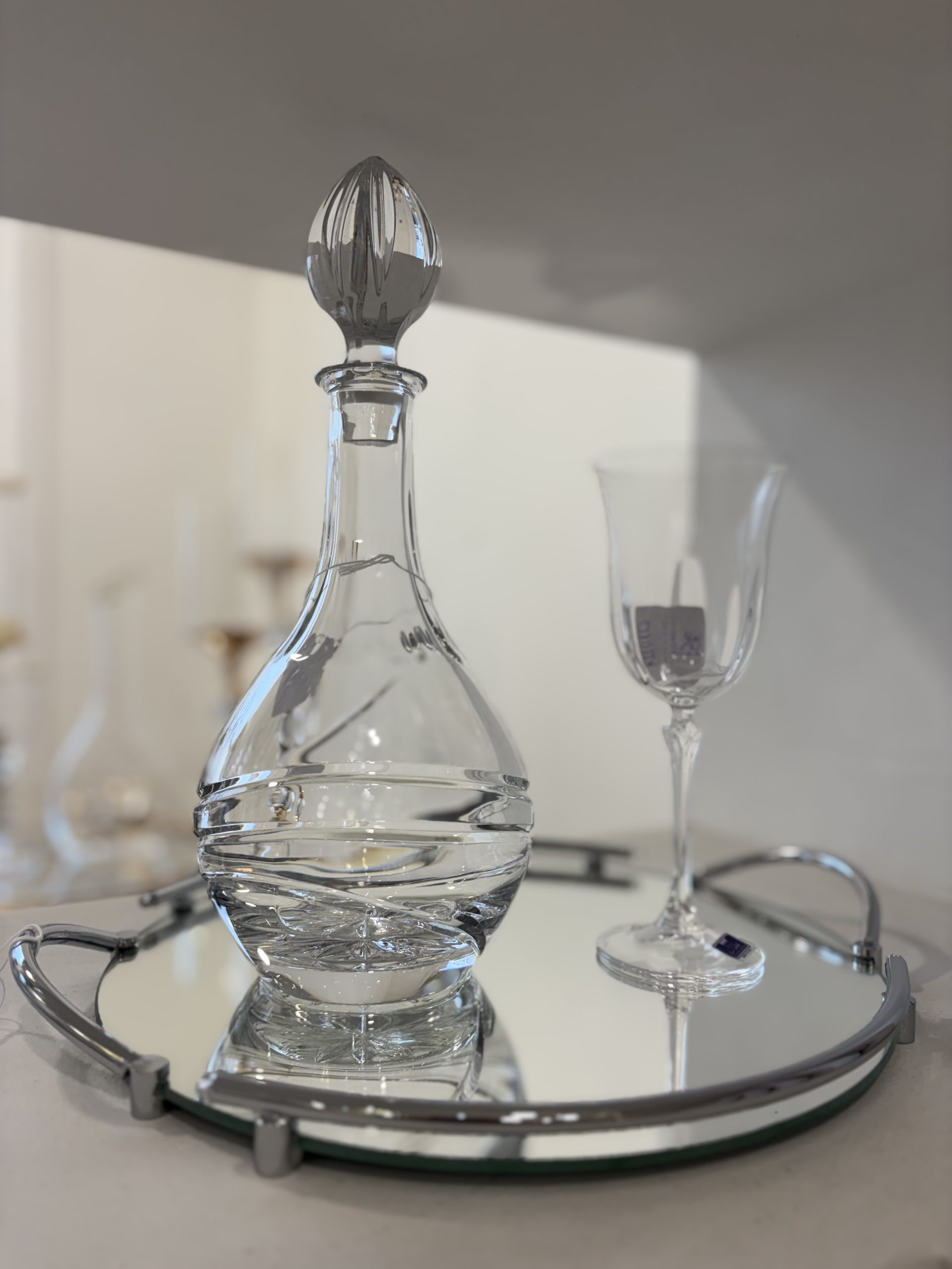 Το σετ περιλαμβανει Δισκος ασημι με καθρεπτη , Καραφα με σχεδιο στο κατω μερος κρυσταλλο bohemian , Ποτηρι κρυσταλλο bohemian με σχεδιο στο ποδι
