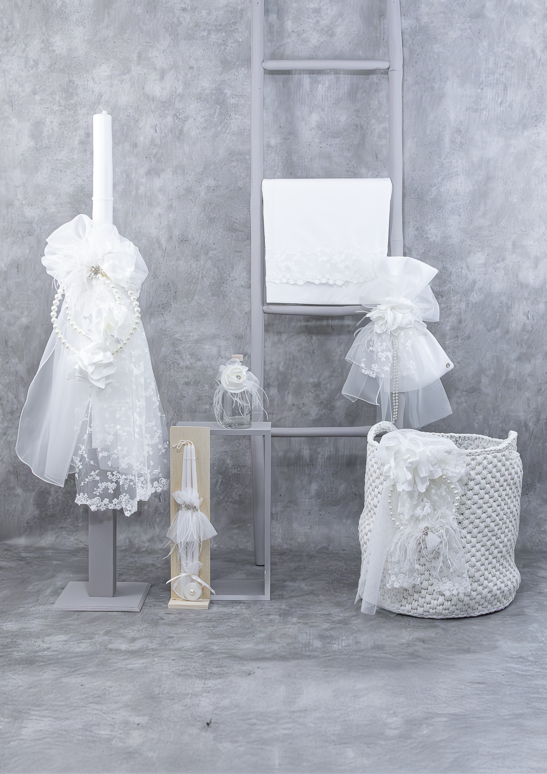 Σετ Βάπτισης για κορίτσι σε χρώματα λευκό και λεπτομέρειες με πέρλες.